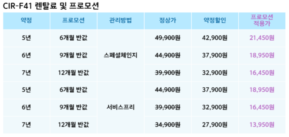 CIR-F41 코웨이 [코웨이] 노블 인덕션 100% All-Free (코드형) 제품분류 전기레인지 기능 인덕션 AS기간 렌탈기간내 이벤트 7천원할인 최저 렌탈가 월 27,900 (렌탈가) 제휴카드 할인가 월 (렌탈가) 5년 6년 7년 서비스프리 스페셜체인지 제품색상 선택 페블 그레이 + 0원 히말라얀 솔트 핑크 + 0원 오트밀 베이지 + 0원 할인 제휴카드 보기 렌탈신청 장바구니