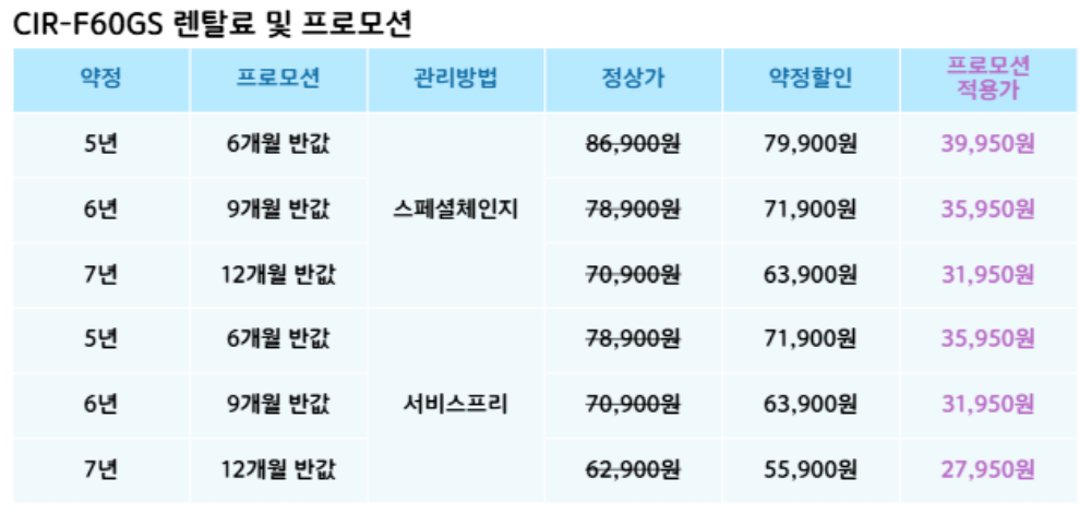 CIR-F60GS 코웨이 [코웨이] 노블 인덕션 100% All-Free 900mm 와이드 (전기공사형) 제품분류 전기레인지 기능 인덕션 AS기간 렌탈기간내 이벤트 7천원할인 최저 렌탈가 월 55,900 (렌탈가) 제휴카드 할인가 월 (렌탈가) 5년 6년 7년 서비스프리 스페셜체인지 할인 제휴카드 보기 렌탈신청 장바구니