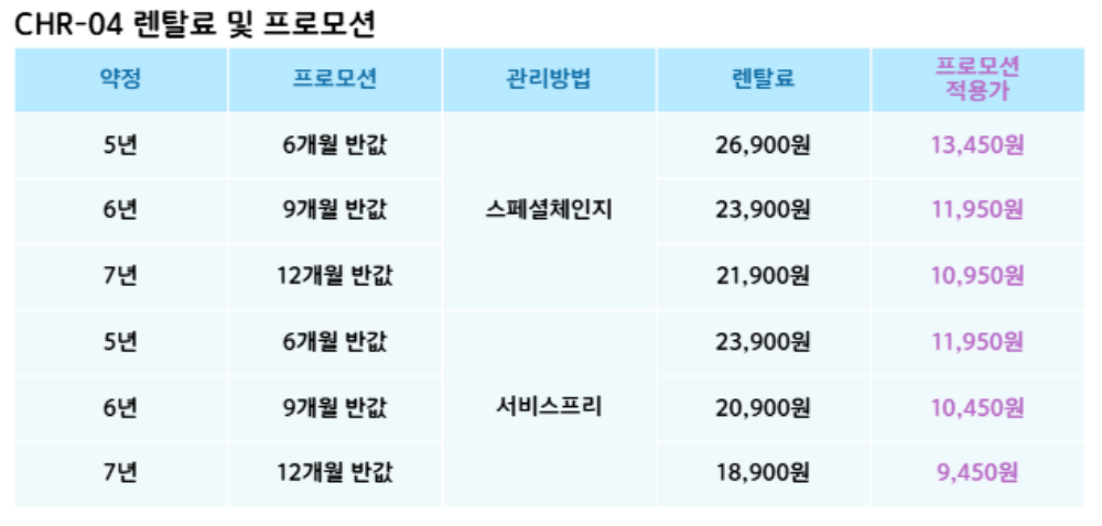 CHR-04 코웨이 [코웨이] 프라임S 하이브리드 제품분류 전기레인지 기능 하이브리드 AS기간 렌탈기간내 최저 렌탈가 월 18,900 (렌탈가) 제휴카드 할인가 월 (렌탈가) 5년 6년 7년 서비스프리 스페셜체인지 할인 제휴카드 보기 렌탈신청 장바구니