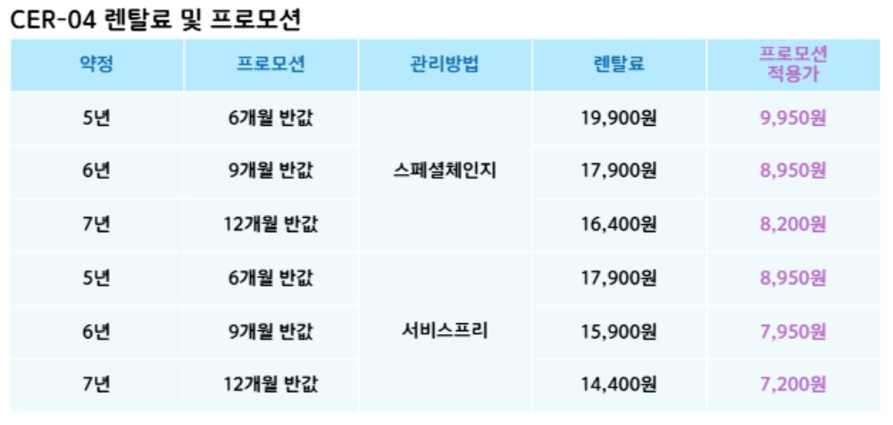 CER-04 코웨이 [코웨이] 프라임S 하이라이트 제품분류 전기레인지 기능 하이라이트 AS기간 렌탈기간내 최저 렌탈가 월 14,400 (렌탈가) 제휴카드 할인가 월 (렌탈가) 5년 6년 7년 서비스프리 스페셜체인지 할인 제휴카드 보기 렌탈신청 장바구니