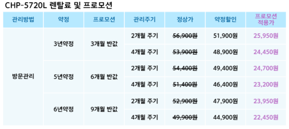 CHP-5720L 코웨이 [코웨이] 프라임 스탠드 제품분류 정수기 정수방식 탱크형 기능 냉온전용 AS기간 렌탈기간내 최저 렌탈가 월 44,900 (렌탈가) 제휴카드 할인가 월 (렌탈가) 3년 5년 6년 방문관리/4개월 방문관리/2개월 제품색상 선택 오트밀베이지 + 0원 할인 제휴카드 보기 렌탈신청 장바구니