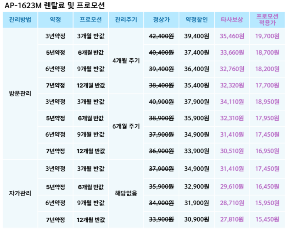 AP-1623M 코웨이 [코웨이] 노블 공기청정기2 16평형 제품분류 청정기 AS기간 렌탈기간내 최저 렌탈가 월 27,810 (렌탈가) 제휴카드 할인가 월 (렌탈가) 3년 5년 6년 7년 자가관리(타사보상) 자가관리 방문관리/6개월(타사보상) 방문관리/6개월 방문관리/4개월(타사보상) 방문관리/4개월 제품색상 선택 포슬린화이트 + 0원 샌드베이지 + 0원 가든그레이 + 0원 임페리얼브라운 + 0원 페블그레이 + 0원 할인 제휴카드 보기 렌탈신청 장바구니