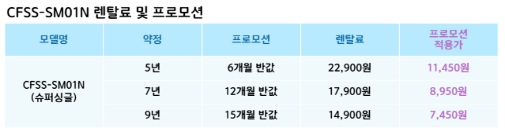 CFSS-SM01N 코웨이 [코웨이] 단매트리스 프레임 네츄럴오크 슈퍼싱글 제품분류 침대 AS기간 렌탈기간내 최저 렌탈가 월 14,900 (렌탈가) 제휴카드 할인가 월 (렌탈가) 5년 7년 9년 할인 제휴카드 보기 렌탈신청 장바구니