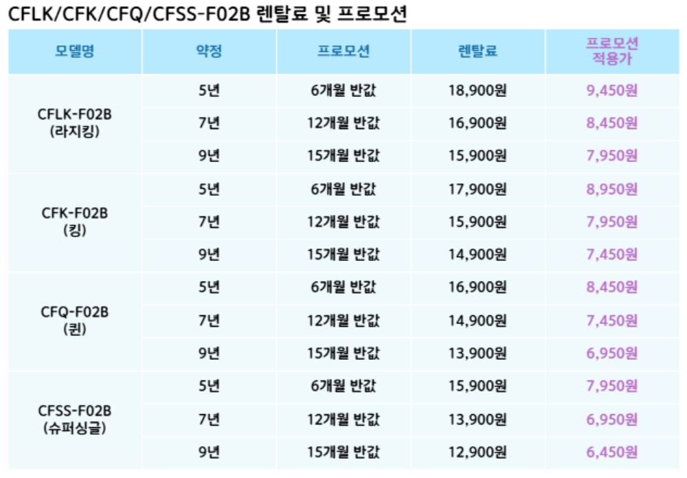 CFSS-F02B,CFQ-F02B,CFK-F02B,CFLK-F02B 코웨이 [코웨이] 파운데이션 브라운 (슈퍼싱글,퀸,킹,라지킹) 제품분류 침대 AS기간 렌탈기간내 최저 렌탈가 월 12,900 (렌탈가) 제휴카드 할인가 월 (렌탈가) 5년 7년 9년 슈퍼싱글 퀸 킹 라지킹 할인 제휴카드 보기 렌탈신청 장바구니