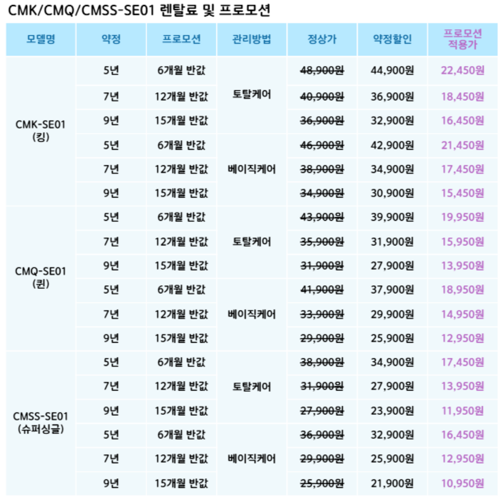 CMSS-SE01,CMQ-SE01,CMK-SE01 코웨이 [코웨이] 비렉스 더블사이드 매트리스 (슈퍼싱글,퀸,킹) 제품분류 매트리스 AS기간 렌탈기간내 최저 렌탈가 월 21,900 (렌탈가) 제휴카드 할인가 월 (렌탈가) 5년 7년 9년 슈퍼싱글 퀸 킹 베이직케어 토탈케어 할인 제휴카드 보기 렌탈신청 장바구니