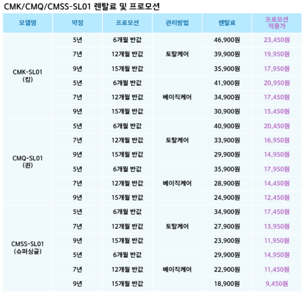 CMSS-SL01,CMQ-SL01,CMK-SL01 코웨이 [코웨이] 탑퍼교체 더블체인지 매트리스 (슈퍼싱글,퀸,킹) 제품분류 매트리스 AS기간 렌탈기간내 최저 렌탈가 월 18,900 (렌탈가) 제휴카드 할인가 월 (렌탈가) 5년 7년 9년 슈퍼싱글 퀸 킹 베이직케어 토탈케어 할인 제휴카드 보기 렌탈신청 장바구니