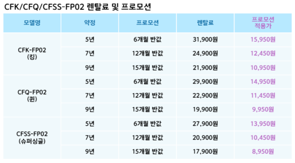 CFSS-FP02,CFQ-FP02,CFK-FP02 코웨이 [코웨이] 마이프레임 볼륨헤드 기본형(슈퍼싱글,퀸,킹) 제품분류 침대 AS기간 렌탈기간내 최저 렌탈가 월 17,900 (렌탈가) 제휴카드 할인가 월 (렌탈가) 5년 7년 9년 슈퍼싱글 퀸 킹 제품색상 선택 민트그린 + 0원 오트밀베이지 + 0원 크림아이보리 + 0원 차콜그레이 + 0원 모카브라운 + 0원 할인 제휴카드 보기 렌탈신청 장바구니