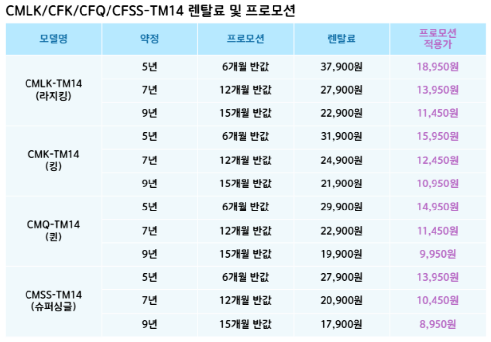 CFSS-TM14,CFQ-TM14,CFK-TM14,CFLK-TM14 코웨이 [코웨이] 비렉스 루나 프레임 (슈퍼싱글,퀸,킹,라지킹) 제품분류 침대 AS기간 렌탈기간내 최저 렌탈가 월 17,900 (렌탈가) 제휴카드 할인가 월 (렌탈가) 5년 7년 9년 슈퍼싱글 퀸 킹 라지킹 헤드보드색상 선택 퓨어아이보리(라지킹/킹/퀸/슈퍼싱글) + 0원 피치핑크(킹/퀸/슈퍼싱글) + 0원 민트스트라이프(킹/퀸/슈퍼싱글) + 0원 파운데이션색상 선택 오트밀베이지 + 0원 차콜그레이 + 0원 퓨어아이보리 + 0원 할인 제휴카드 보기 렌탈신청 장바구니